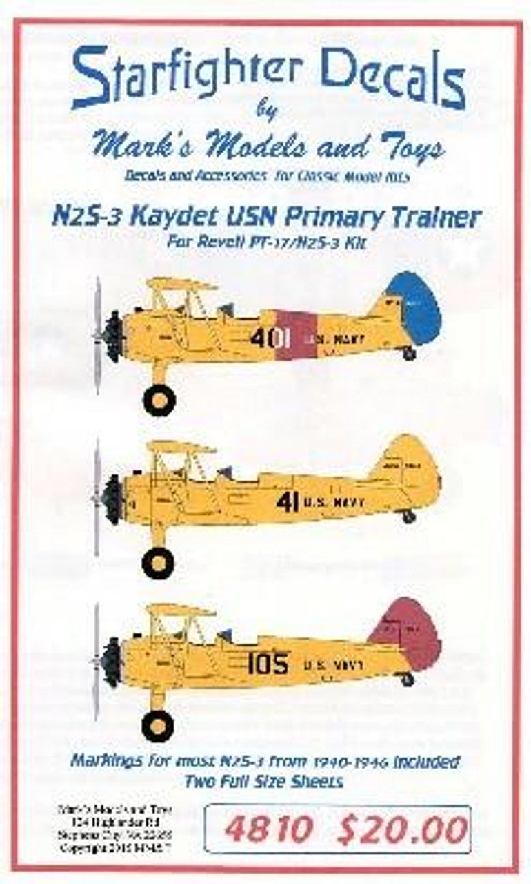 4810. Two sheets. Designed for the Revell PT-17/N2S-3 kit.Set contains markings for 2-4 aircraft. Sheet One has Numbers in Black and White in two different sizes, 4 different styles of US Insignia and stencil data. Sheet 2 has Wing and Fuselage bands in 4 different colors, Wing Walks, Bu.No. and USN Logos.Color placement sheet has 3 suggested paint schemes plus data to re-create any of the thousands of N2S Kaydets in USN service form WWII.