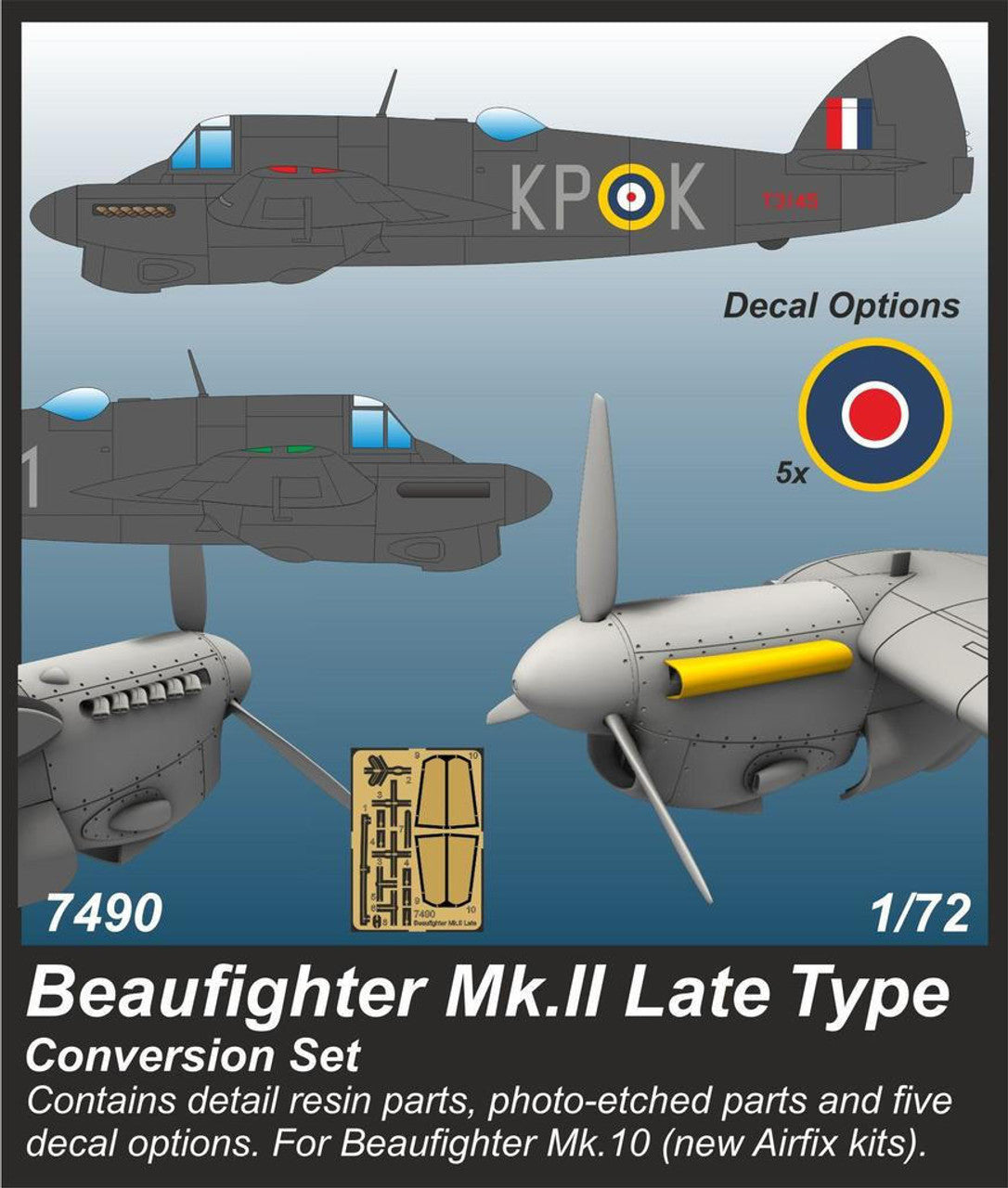The Beaufighters of all versions were powered by Hercules radials. The only exception was the Mk.II version which was fitted with the Merlin in-line engines. Along with the British squadrons of the RAF, the Mk.IIs were also operated by Polish, Canadian, Czechoslovak and Australian units. The set offers conversion parts to build the later type with two different exhaust manifolds. Etches and decals – for three RAF and one FAA airframes included.