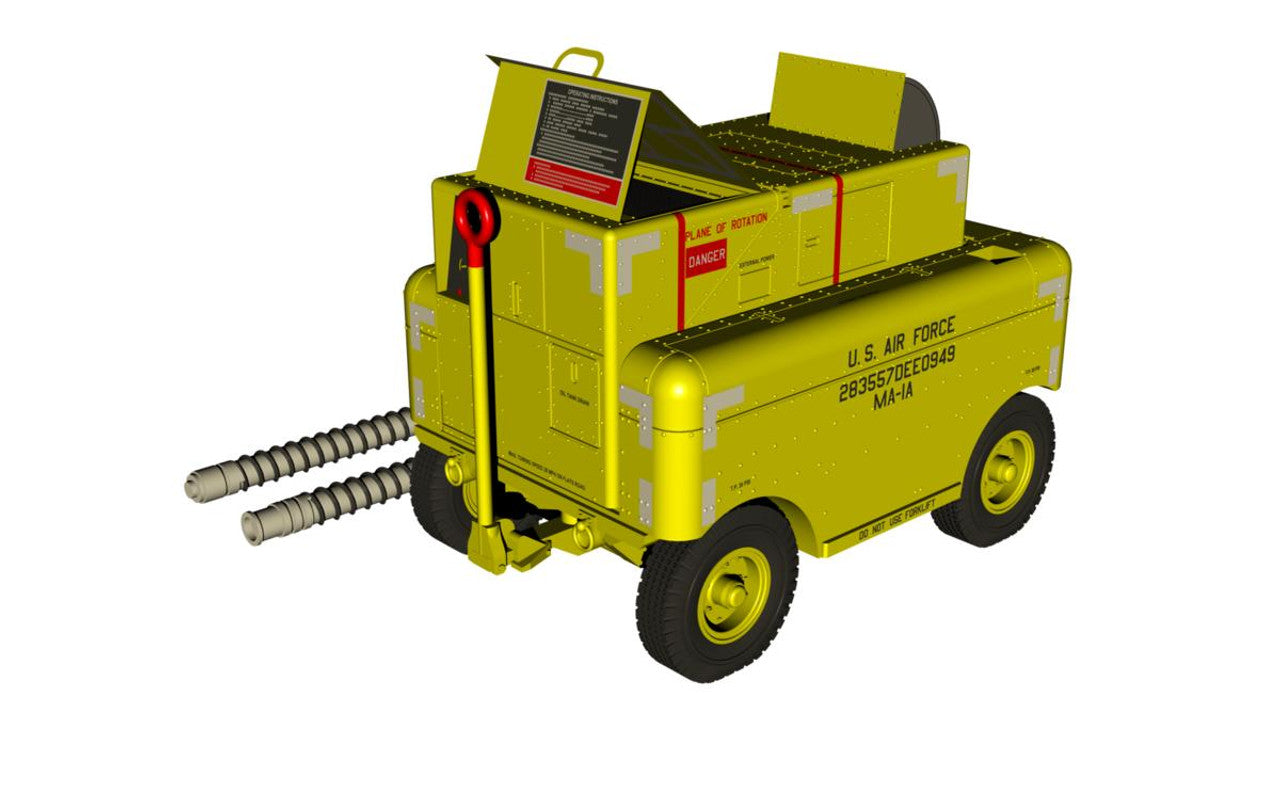 High pressure air starter unit used for starting an aircraft jet engine by means of high velocity air generated by a small turbine inside the cart. The MA-1A cart was in service since the 1950s and and was used to start number of US jet engine aircraft such as the T-33A, T-38 and many others, but could have been used with the huge C-130 turboprop as well. Set includes etching and decals.