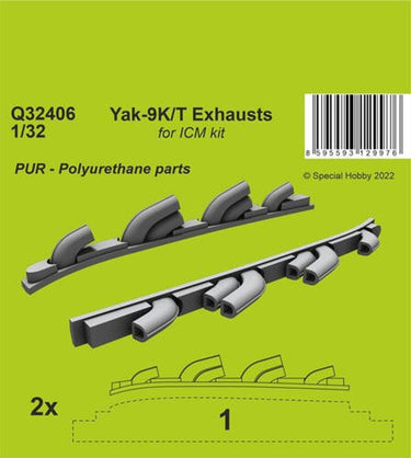 Resin cast exhausts with hollowed out ends and some more detail are a direct replacement of the original styrene ones of ICM’s Yak-9 kit.