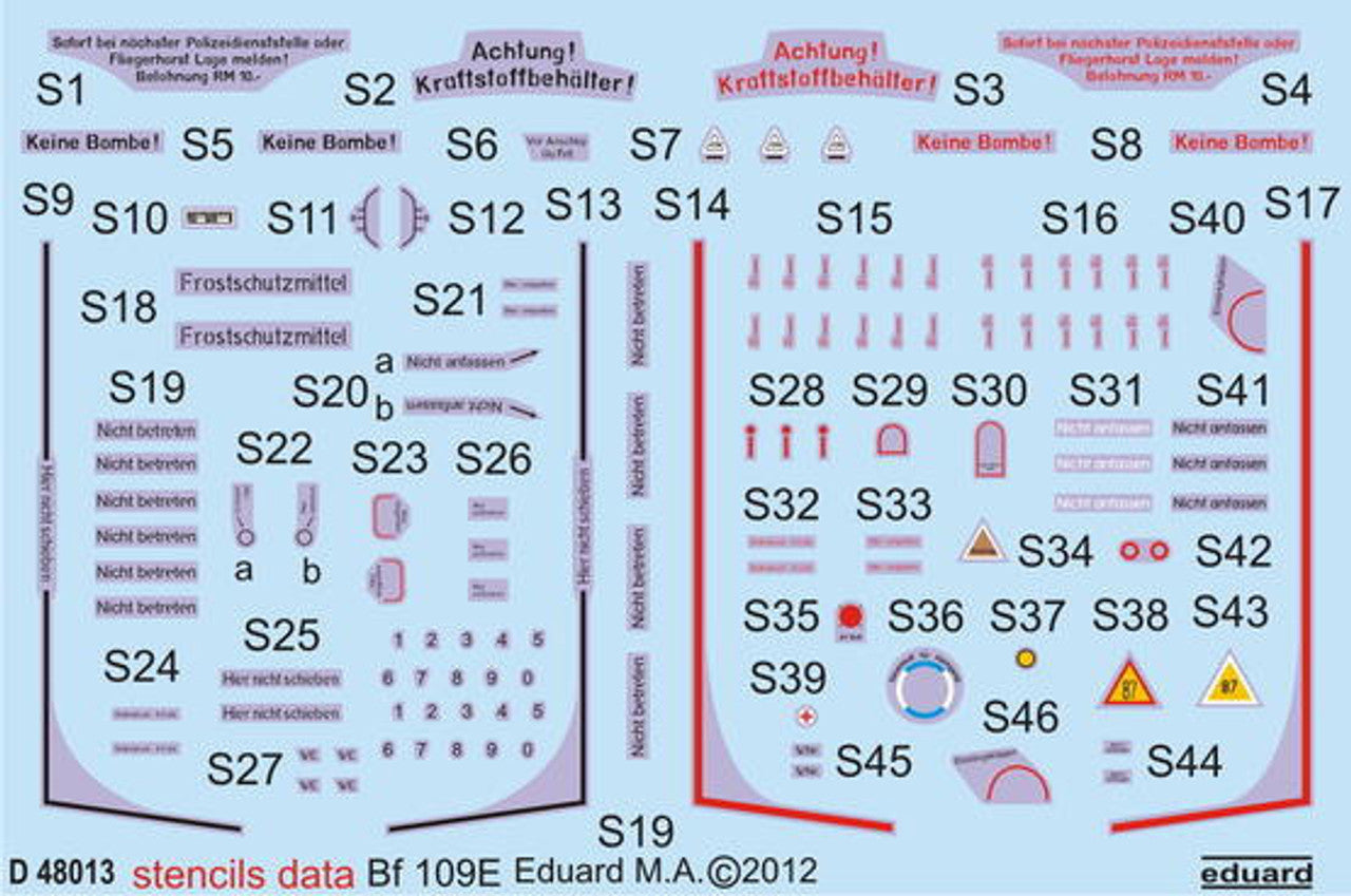 A complete set of instruction and maintenance stencils for the Bf 109E in black, red and white variants, walkways on wings in black and red variant, external fuel tank stencils (in red and black).The yellow triangles for the fuel tank gap in two versions.
