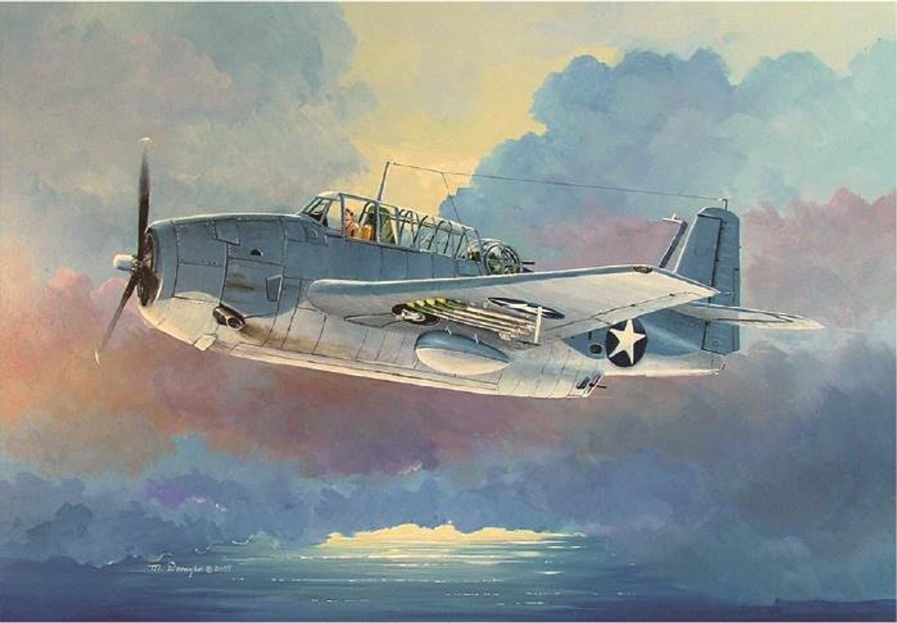 First flown on 1 August 1941, the three-seat Grumman TBF-1 Avenger torpedo-bomber entered US Navy service just in time to participate in the Battle of Midway in June 1942. During its World War II lifespan, the Avenger design changed very little, and this allowed it to be built in huge quantities. Demand for the airplane was so great that the General Motors Company was also contracted to build it, under the designation TBM-1, beginning in September 1942.      Over 1,000 TBF/TBMs (designated Avenger Mk I) were also used by the Royal Navy's Fleet Air Arm in both Atlantic and Pacific theaters. The Avenger was also used by the Royal New Zealand Air Force.