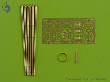 The set includes turned brass barrels and etched barrel clamps. It is very simple to use in Your model, and makes it extremely realistic. Simply cut off the original plastic barrel and drill a hole in the remaining plastic parts. Insert the metal barrel using Cyanoacrylate adhesives.
