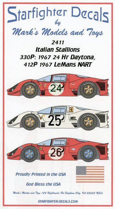 Markings for two 412P and a 330P4. Suggested kit: Fujimi.      Markings for all 3 cars included. Car 24 was a 330P4 finishing 2nd at the 1967 Daytona 24 hour race; Car 25 was 412P raced at the 1967 Le Mans; and Car 26 was a 412P and finished 3rd at the 1967 Daytona 24 hr race. Cars 24 and 26 come with the correct Florescent number outlines.      Color placement guide included. Pracing horse badges need to be sourced from official sources if desired.